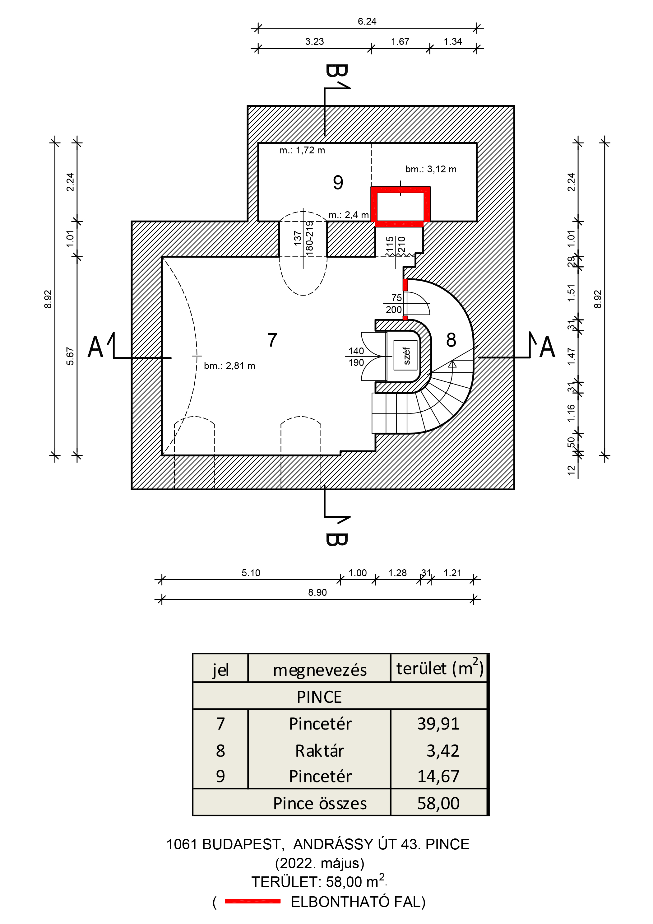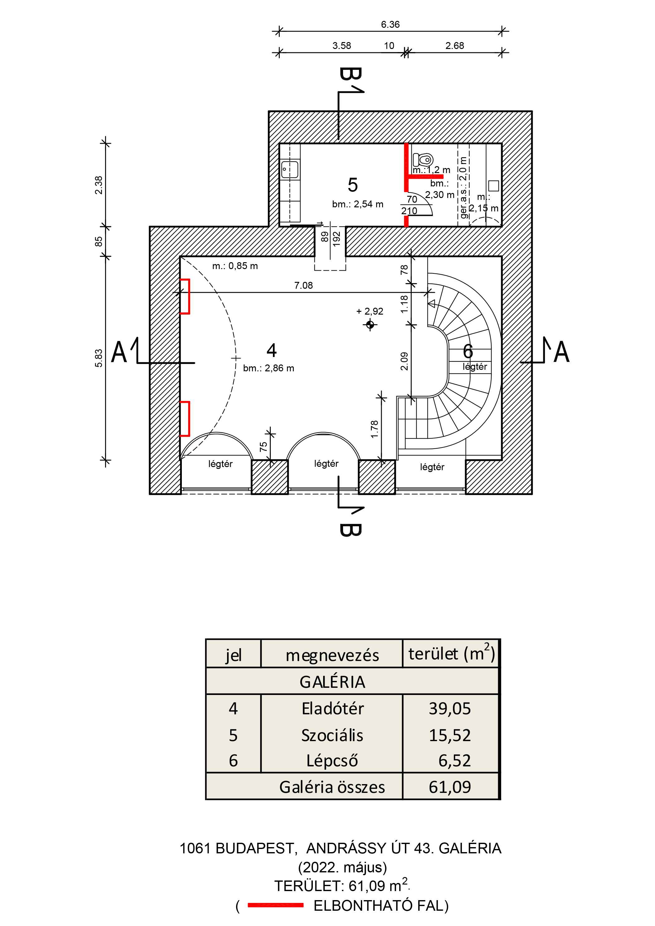 Földszint: 67,18 m2, galéria: 61,09 m2, pince: 58,00 m2.